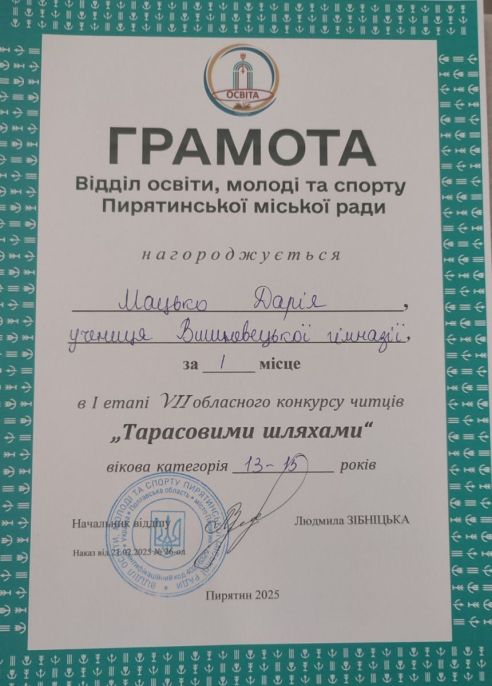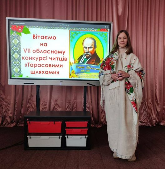 Вітаємо ученицю 6 класу Мацько Дарію - переможницю І етапу VII обласного конкурсу читців " Тарасовими шляхами" у середній віковій групі. Уривок з поеми Т. Шевченка " Розрита могила".