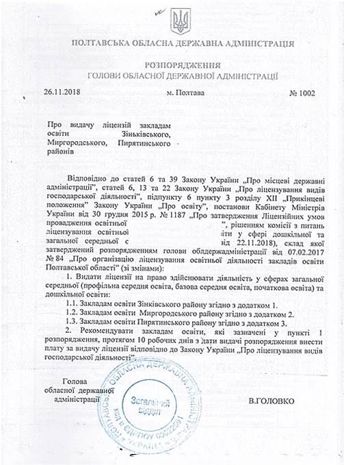 Розпорядження голови обласної адміністрації "Про видачу ліцензій закладам освіти"