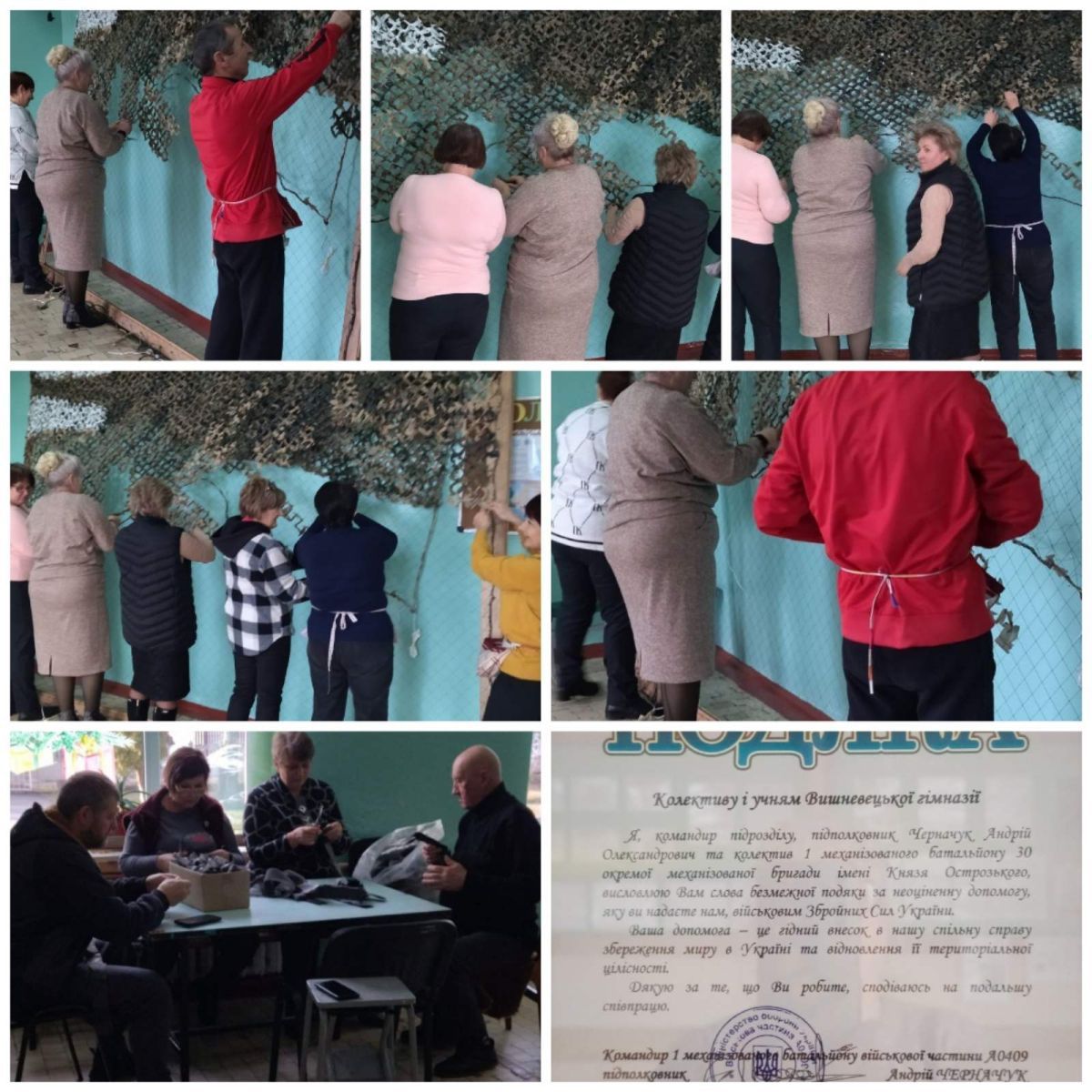 Гімназія перетворилася у потужний волонтерський хаб з виготовлення маскувальних сіток . Плетуть учителі з думками та молитвами про захист життя нашим Захисникам, бо якісне маскування – врятовані життя бійців . Плетіння маскувальних сіток для ЗСУ – це не лише практична підтримка захисників, а й символ вдячності та солідарності, дієвий спосіб висловити нашу повагу та підтримку хоробрим воїнам.